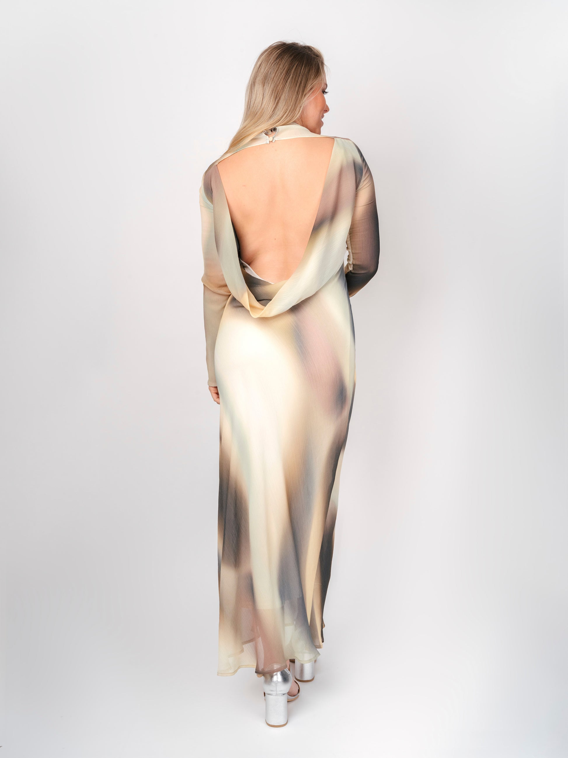 Este elegante vestido de manga larga te cautivará por su estilo vaporoso, su color degradé, la fluidez y su movimiento. Perfecto para ocasiones especiales, su diseño presenta una espalda descubierta que aporta un toque audaz y sofisticado. Ideal para eventos formales o una salida nocturna, este vestido combina elegancia y comodidad, asegurando que te sientas increíble durante toda la noche.